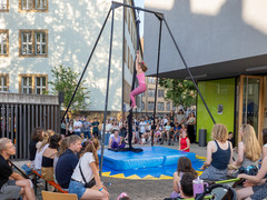 Am uni.fest sind auch die kleinen Besucherinnen und Besucher herzlich willkommen! Die Familiengerechte Hochschule feiert in diesem Jahr ihr 20-jähriges Bestehen mit besonderen Programmpunkten für Familien auf unserer dritten Bühne. Ab 16 Uhr steht zudem der Außenbereich der KinderVilla den Kindern am uni.fest zur Verfügung und die Spielgeräte können genutzt werden. Die familiengerechte Hochschule bietet zudem ein buntes Kinderprogramm an: