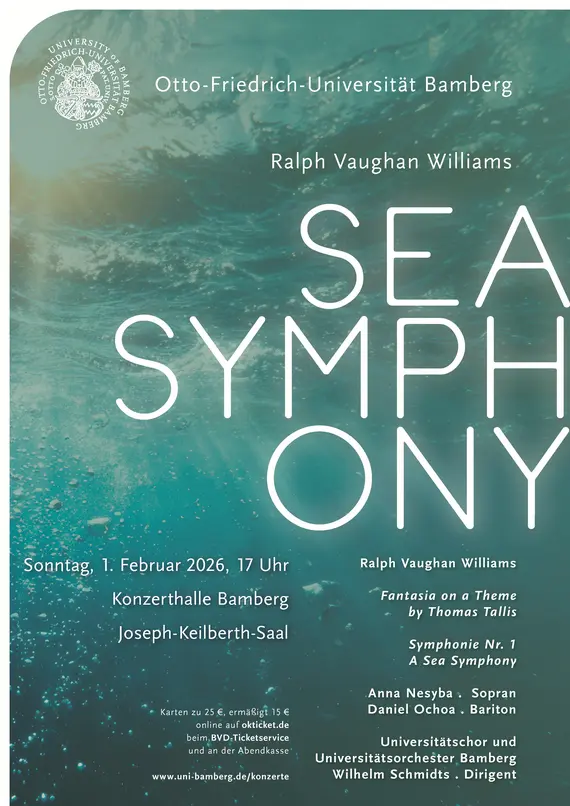 Als eine der größten Chorsinfonien ihrer Zeit stellt die „Sea Symphony“ höchste Anforderungen an Besetzung und Ausführende. Mit nahezu 200 Mitwirkenden in Chor und Orchester bündeln sich die Kräfte der Bamberger Universitätsmusik zu einem klanglich eindrucksvollen Ensemble, das ein intensives und selten zu erlebendes Live-Erlebnis verspricht. Unterstützt werden die ambitionierten Musikerinnen und Musiker von der Sopranistin Anna Nesyba und dem Bariton Daniel Ochoa, zwei renommierten Solisten, die mit berührendem Sologesang begeistern. Darüber hinaus erklingt Vaughan Williams’ „Fantasia on a Theme by Thomas Tallis“ für doppeltes Streichorchester, ein Werk, das – wie die „Sea Symphony“ – weit gespannte Klangräume erschließt.