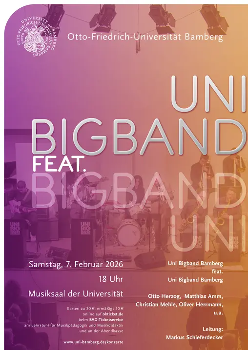 Ob mit Swing-Standards oder modernen Fusion- und Latin-Arrangements – Uni-Bigband und Jazz-Combos begeistern ihr Publikum zum Semesterende jedesmal aufs Neue mit temperamentvoller Spielfreude. Bandleader Markus Schieferdecker leitet die Ensembles schon seit zehn Jahren mit großem Erfolg und sorgt stets dafür, dass auch internationale Jazz-Größen zu Gast sind – lassen Sie sich überraschen, wer diesmal eingeladen ist!