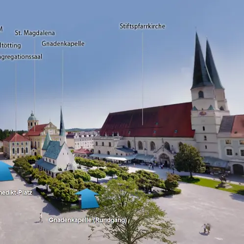 Von der Luftansicht des Kapellenplatzes des Wallfahrtortes Altöttung ab, können weitere Kirchen wie St. Anna oder die Gnadenkappelle begangen werden. Auch Schätze der Kirchen oder Denkmäler können betrachtet werden.
