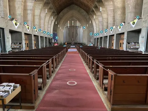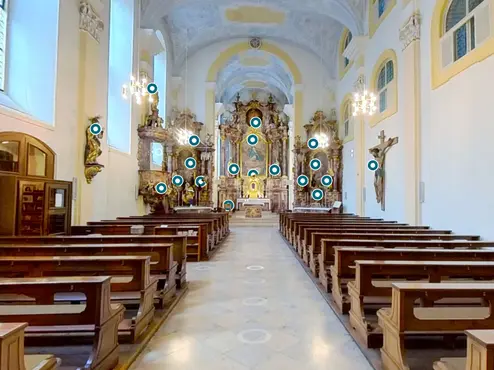 Aufgrund der Verwendung einer 360°-Kamera können die virtuellen Kirchenräume, die im SoSe 2023 erstellt wurden, vollständig in 360° erkundet werden. Das heißt: Im Gegensatz zu den 3D-Modellen des Vorjahres, die mit einer Smartphone-Kamera aufgenommen wurden, können nun auch die Decken der Kirchengebäude betrachtet werden.