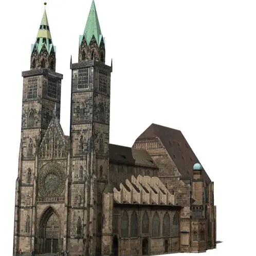St. Lorenz ist eine protestantische gotische Kirche mitten in Nürnberg. Sie wurde zwischen 1250 und 1360 auf den Grundmauern einer früheren romansichen Basilika erbaut. Die Fenster sowie der Eingangsbereich stellen einen typischen gotischen Baustil dar, der an diesem Model gut verdeutlicht wird.