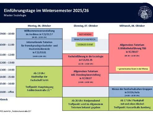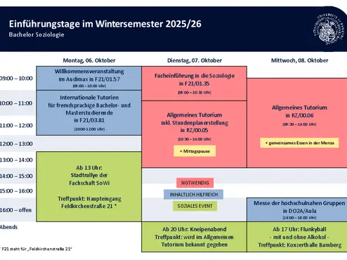 In jedem Semester finden eine Woche vor dem Beginn der Vorlesungszeit die Erstsemestereinführungstage statt. Dort erhalten Sie neben allgemeinen Informationen zum Studium an der Otto-Friedrich-Universität Bamberg im Rahmen einer Facheinführung sowie Tutorien spezielle Informationen zum Studium der Soziologie in Bamberg.