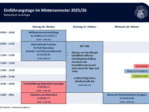 Alle wichtigen Informationen zum Nebenfach Soziologie werden in der Facheinführung und in den Tutorien am Montag, den 06. Oktober gegeben. Darüber hinaus finden Sie alle weiteren Termine zu Ihren Hauptfächern auf den Seiten der zentralen Studienberatung.
