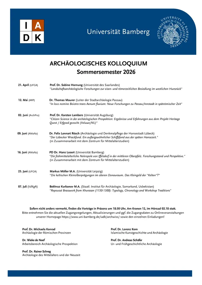 | 16. Juni | PD Dr. Hans Losert (Universität Bamberg) "Die frühmittelalterliche Nekropole von Iffelsdorf in der mittleren Oberpfalz. Forschungsstand und Perspektive." (in Zusammenarbeit mit dem Zentrum für Mittelalterstudien) |
