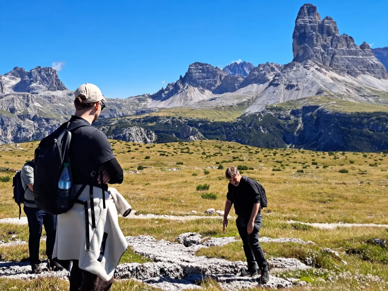 Der siebte Exkursionstag stand ganz im Zeichen der Frontlandschaft des Ersten Weltkriegs in den Dolomiten. Unter der Führung des ehemaligen Mitglieds des österreichischer Militärs Vizeleutnant i.R. Friedl Kalser und seines Begleiters, beide Mitglieder des Vereins „Dolomitenfreunde“[38], unternahm die Gruppe eine Wanderung auf die Plateaus Monte Piana (Stellungen Italiens) und Monte Piano (Stellungen Österreich-Ungarns) Das Bergmassiv war während des Krieges heftig umkämpft und markierte die Frontlinie zwischen österreichisch-ungarischen und italienischen Truppen, die teilweise nur wenige Meter voneinander entfernte Schützen- bzw. Laufgräben, Kavernen und Feuerstellungen hielten[39]. Die Begehung unter der Leitung des Teilnehmers Philipp Scheu bot zahlreiche Einblicke in das System der Stellungen, Kavernen und Verbindungsgräben, die sich noch heute deutlich im Gelände abzeichnen[40]. Die Reste der militärischen Bauten und Geländeüberformungen sind heute als Freilichtmuseum ausgewiesen[41].