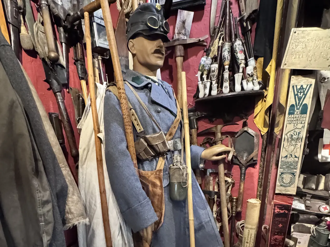 Als Einstieg in die Exkursion bot die Sammlung von Hrn. Dr. Markus Arnold die besondere Gelegenheit, sich mit der Vielfalt der materiellen Zeugnisse des Ersten Weltkriegs in Tirol und den Dolomiten vertraut zu machen. Die Arnoldsche Sammlung ist nicht nur sehr umfassend, sondern mittlerweile auch der Öffentlichkeit über mehrere Publikationen zugänglich[3].