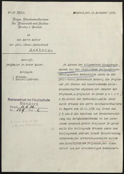 Die für die Universitäten anberaumten Gleichschaltungsmaßnahmen galten weitgehend auch für die (kleineren) Hochschulen. In Bezug auf die Philosophisch-Theologischen Hochschulen Bayerns entwickelten sie jedoch weniger Durchschlagskraft, was nicht zuletzt an der speziellen Fächerstruktur mit dem Schwerpunkt auf Theologie und der engen Verbindung mit der Katholischen Kirche lag. Das Erzbistum Bamberg behielt nach wie vor ein Mitspracherecht bei der Bestellung der Rektoren und der Besetzung der theologischen Professuren.