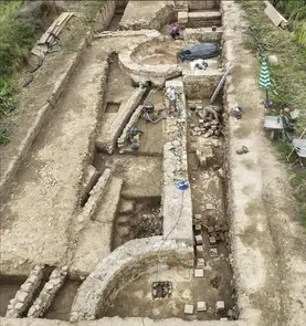 Thermen: Im Nordwestteil des Gebäudes wurde der Badetrakt in unerwartet guter Erhaltung angeschnitten: zwei halbrunde Apsiden für das über einem hypokaustum angelegte Warmwasserbecken und ein Kaltwasserbecken mit einer dreistufigen Treppe in der Beckenecke, zudem Ziegelböden sowie ein Abflusskanal (Abb. 18-19). In seinem Vorraum und im Laubad, das als Durchgangsraum vom Kalt- zum Warmbad diente, lagen eine im Ganzen verstürzte, bemalte Wand- oder Deckendekoration sowie Estrichbodenbrocken. Wie ein Plissee haben sich die abgerutschten Teile des bemalten Verputzes zusammengefaltet. Als Haftgrund für den Putz wurden flache Dachziegel verwendet, die ihrerseits eine Art Zwischenlager zur Decke darzustellen scheinen.