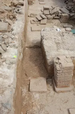 Die höchste Position innerhalb der Stadtanlage nimmt das basilikale Gebäude A ein (Abb. 5; 10-12). Die baulichen Überreste dieser zweischiffigen basilica befinden sich bis zu 3 m tief unter der heutigen Geländeoberfläche, der römische Laufhorizont ist nicht erhalten. In nachantiker Zeit und bis in die Neuzeit wurde das Gebäude ausgebrochen, sein Steinmaterial aus Mauern und Böden wiederverwendet oder zu Kalk gebrannt (Abb. 10). Im Rahmen der jüngsten Arbeiten konnten dennoch die Reste mächtiger Mauern von bis zu 2 m Breite nachgewiesen werden, die Zeugnis von der einstigen Monumentalität des Gebäudes ablegen (Abb. 11). Die großen behauenen Sandsteinbruchstücke in der Wiedereinfüllung lassen auf eine mit Gebäude D2 identische Konstruktion mit einem Fundamentsockel aus Sandsteinblöcken schließen, der, nach den Kalksteinfragmenten im Schutt zu urteilen, die Basis für das aufgehende Mauerwerk aus Handquadern bzw. Bruchsteinen war. Dachziegelfragmente belegen ein Ziegeldach.
