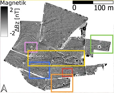 Systematische geophysikalische Messungen in Kooperation mit dem Arbeitsbereich „Archäologische Prospektion“ der Universität Bamberg und dem LAD (Dr. Wieke de Neef; Dr. Natalie Pickartz) auf über 25 ha Fläche begleiteten seit Frühjahr 2023 die Ausgrabungen im Kernbereich der Siedlung (Abb. 23). Ziele dieser großflächigen Maßnahmen sind die Identifizierung von Bebauungslinien zur Rekonstruktion von Straßen und Plätzen, zudem erhoffen wir uns dadurch Antworten auf die Frage der Ausdehnung und Funktion der westlich, südlich und nördlich anschließenden Siedlungsareale.