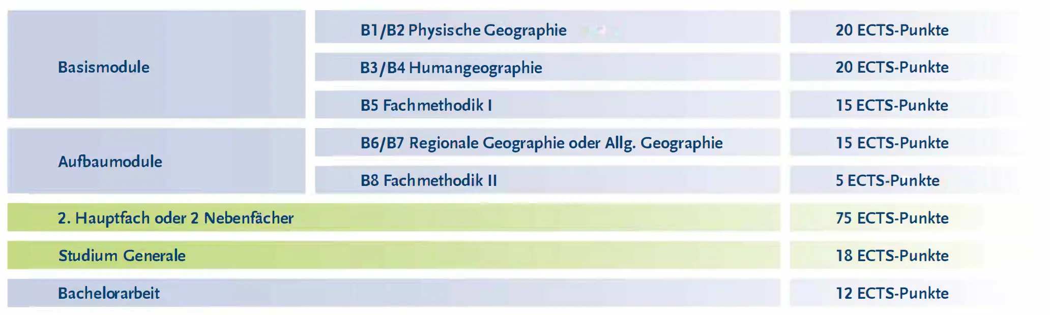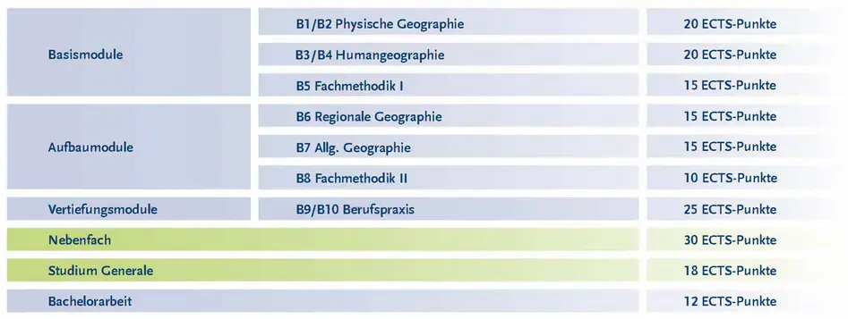 Sie können Geographie als Nebenfach (30 ECTS-Punkte) studieren. Dann setzt sich Ihr Studium so zusammen: Hauptfach 75 ECTS-Punkte + Nebenfach 45 ECTS-Punkte + Nebenfach (Geographie) 30 ECTS-Punkte + Studium Generale 18 ECTS-Punkte + Bachelorarbeit 12 ECTS-Punkte = 180 ECTS-Punkte ODER Erweitertes Hauptfach 120 ECTS-Punkte + Nebenfach (Geographie) 30 ECTS-Punkte + Studium Generale 18 ECTS-Punkte + Bachelorarbeit 12 ECTS-Punkte = 180 ECTS-Punkte.