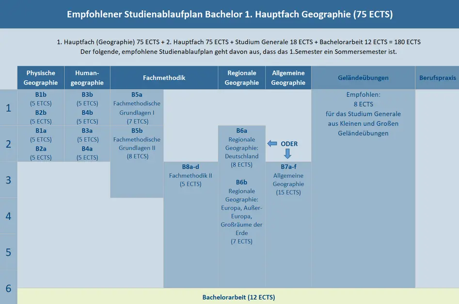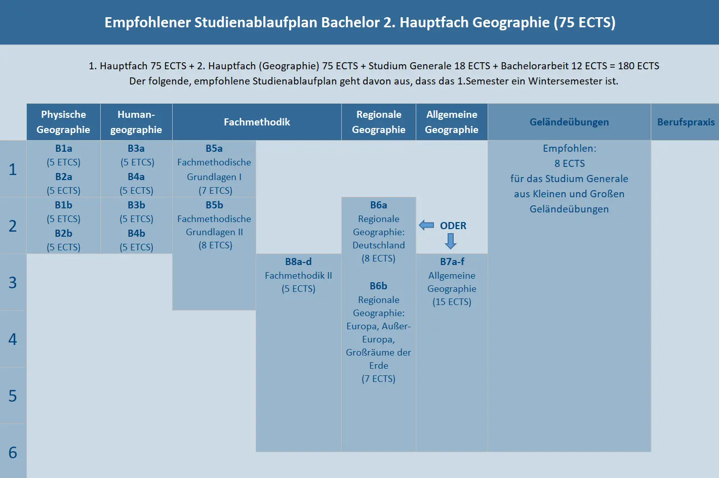 Sie können Geographie als Erstes Hauptfach studieren. Dann setzt sich Ihr Studium so zusammen: Erstes Hauptfach (Geographie) 75 ECTS-Punkte + Zweites Hauptfach 75 ECTS-Punkte + Studium Generale 18 ECTS-Punkte + Bachelorarbeit 12 ECTS-Punkte (Geographie) = 180 ECTS-Punkte.