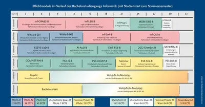 Das Bachelorstudium Informatik führt nach einer Regelstudienzeit von sechs Semestern zum Abschluss Bachelor of Science (B.Sc.). Es sieht weitreichende Wahlmöglichkeiten vor und erlaubt damit eine an persönlichen Interessen ausgerichtete Vertiefung in verschiedenen Bereichen der Informatik sowie eine grundlegende Beschäftigung mit möglichen Anwendungsfächern.