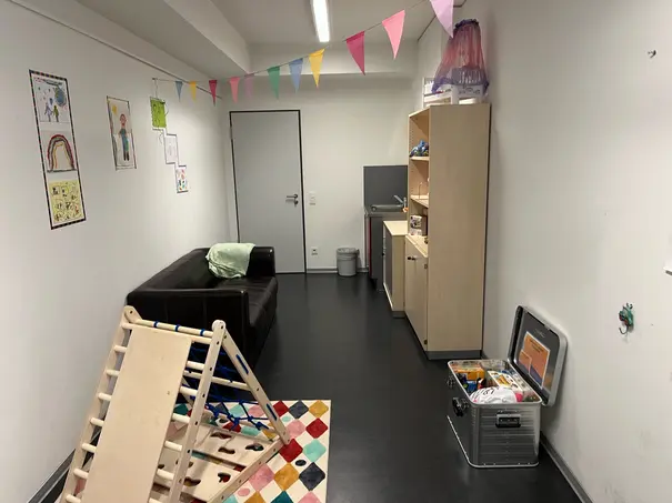 Im Familienzimmer befindet sich ein Sofa, sowie Klettermöglichkeiten für Kinder, ein Schreibtisch mit Bildschirm und Dockingstation, sowie verschiedene Spielsachen. Wickelmöglichkeiten gibt es im EG in der Damen-und Herrentoilette