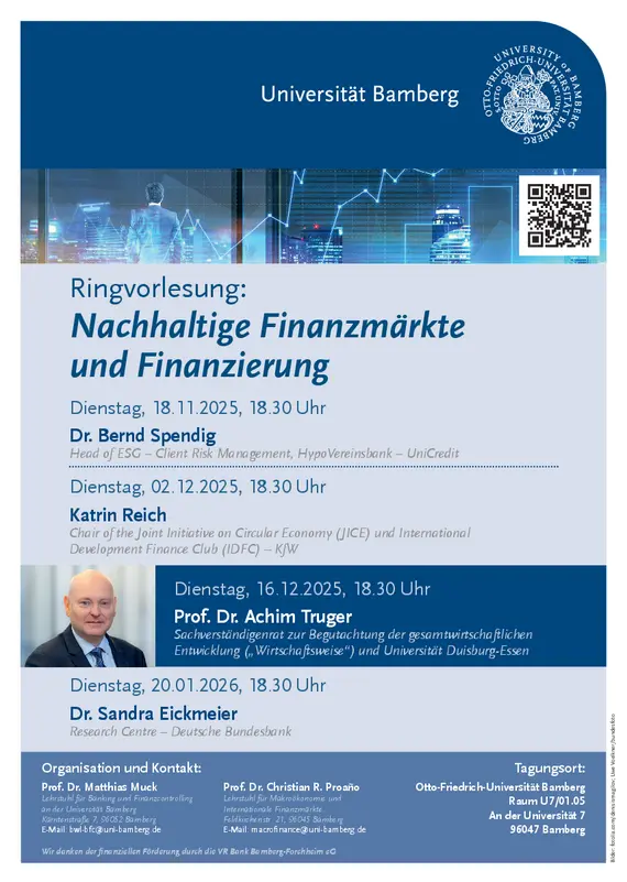 Dr. Bernd Spendig | Head of ESG - Client Risk Management, HypoVereinsbank - UniCredit Vortragstitel: ESG Ratings: Vergleichbarkeit und Konsistenz - ein Blick hinter die Kulissen | 18.11.2025, 18.30h Raum: U7/01.05 |