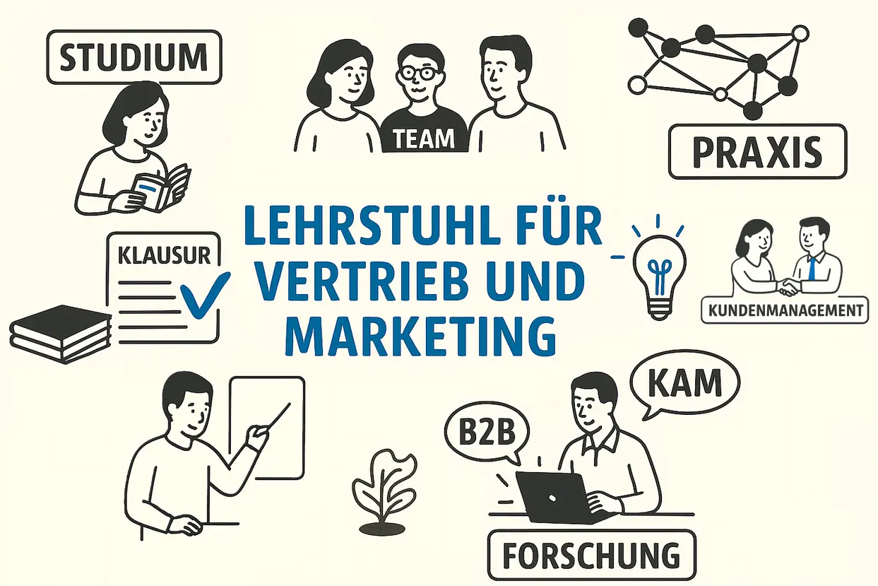 Unser Team engagiert sich in Forschung, Lehre und Praxisprojekten zu aktuellen Themen rund um Vertrieb und Marketing. Dabei verbinden wir wissenschaftliche Erkenntnisse mit praxisnahen Ansätzen in enger Zusammenarbeit mit Studierenden, Forschenden und Partnern aus Wissenschaft & Wirtschaft.