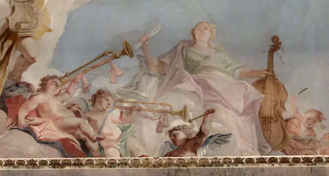Bild: Ausschnitt des Deckengemäldes im Festsaal der Residenz Ansbach (Carlo Carlone 1734), Orthofoto nach Restaurierung, Frühjahr 2025 (Bearbeitung: John Hindmarch, Michael Groh, Mona Hess, Team der Digitalen Denkmaltechnologien, Universität Bamberg); Musikempfehlung um die entsprechenden Instrumente zu sehen „Tönet Ihr Pauken, erschallet Trompeten“ (BWV 214, 1733), J.S. Bach