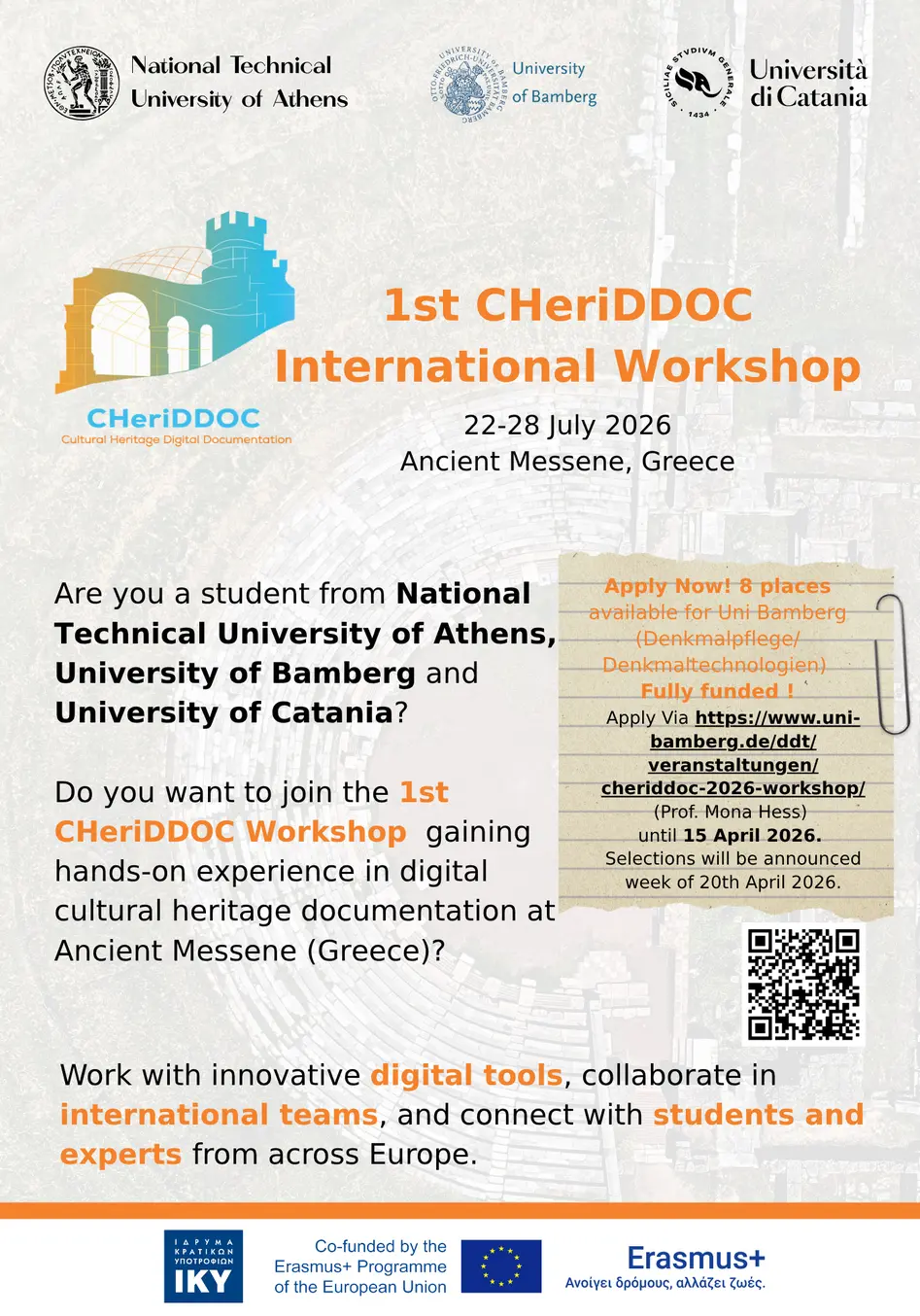 Other places are reserved for students from National Technical University of Athens (NTUA) and University of Catania with similar background studies (heritage documentation, geoinformation, heritage conservation). Shared accomodations. Transport / accomodation etc. will be paid for by the project. Workshop language is English. Place Ancient Messene and surroundings. Introductory Online-meeting will take place in May or June 2026 - to be announced!