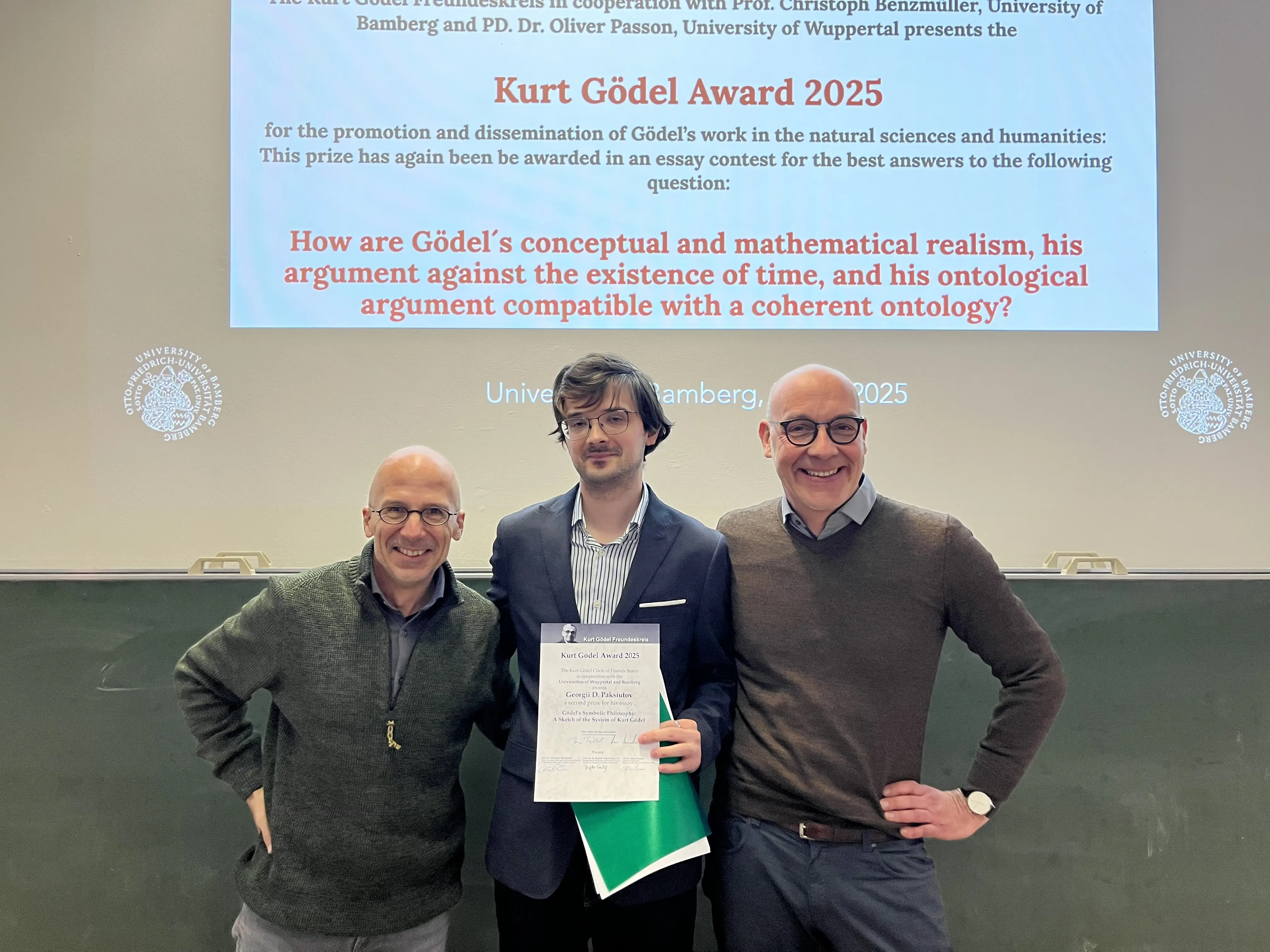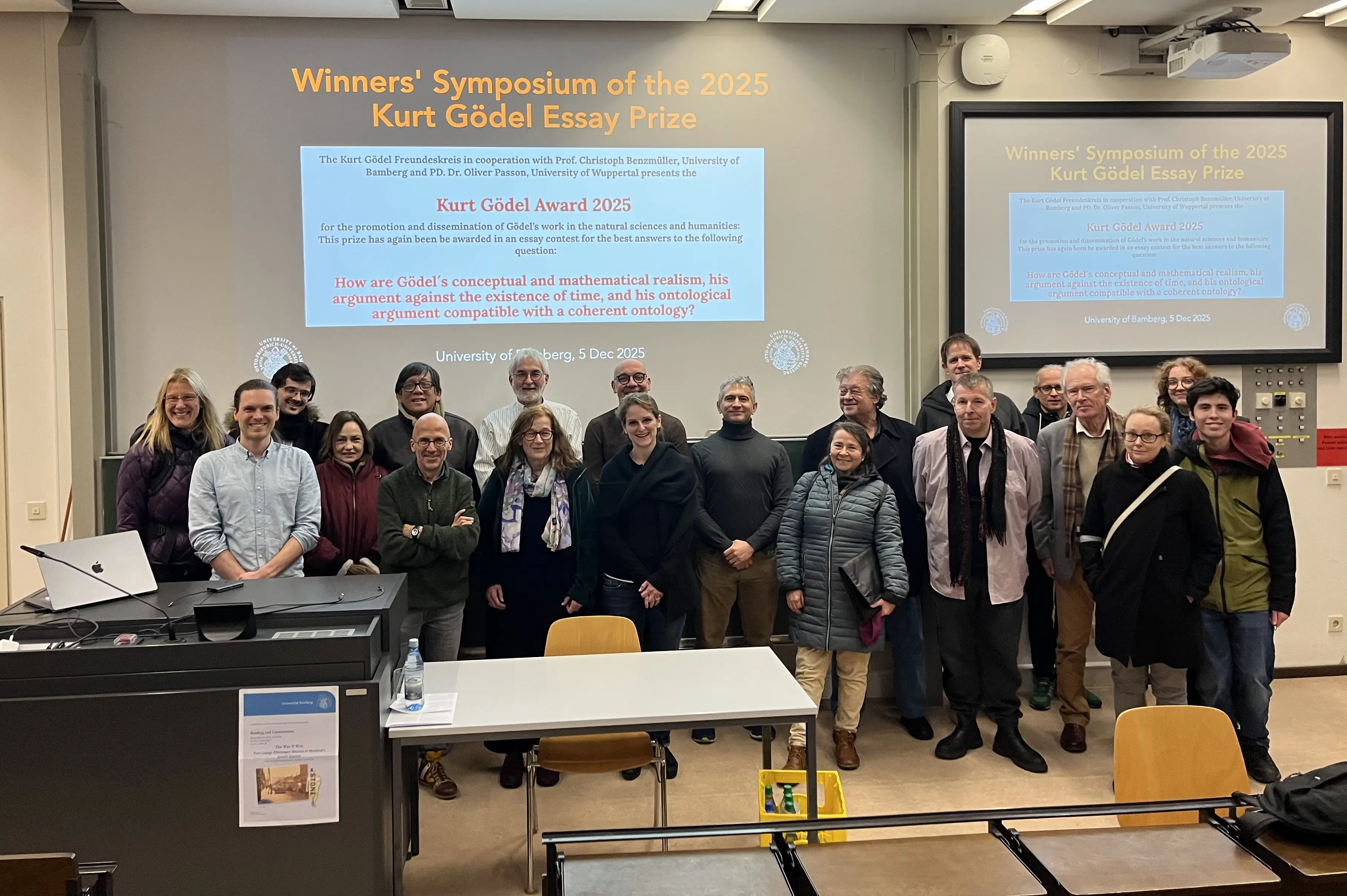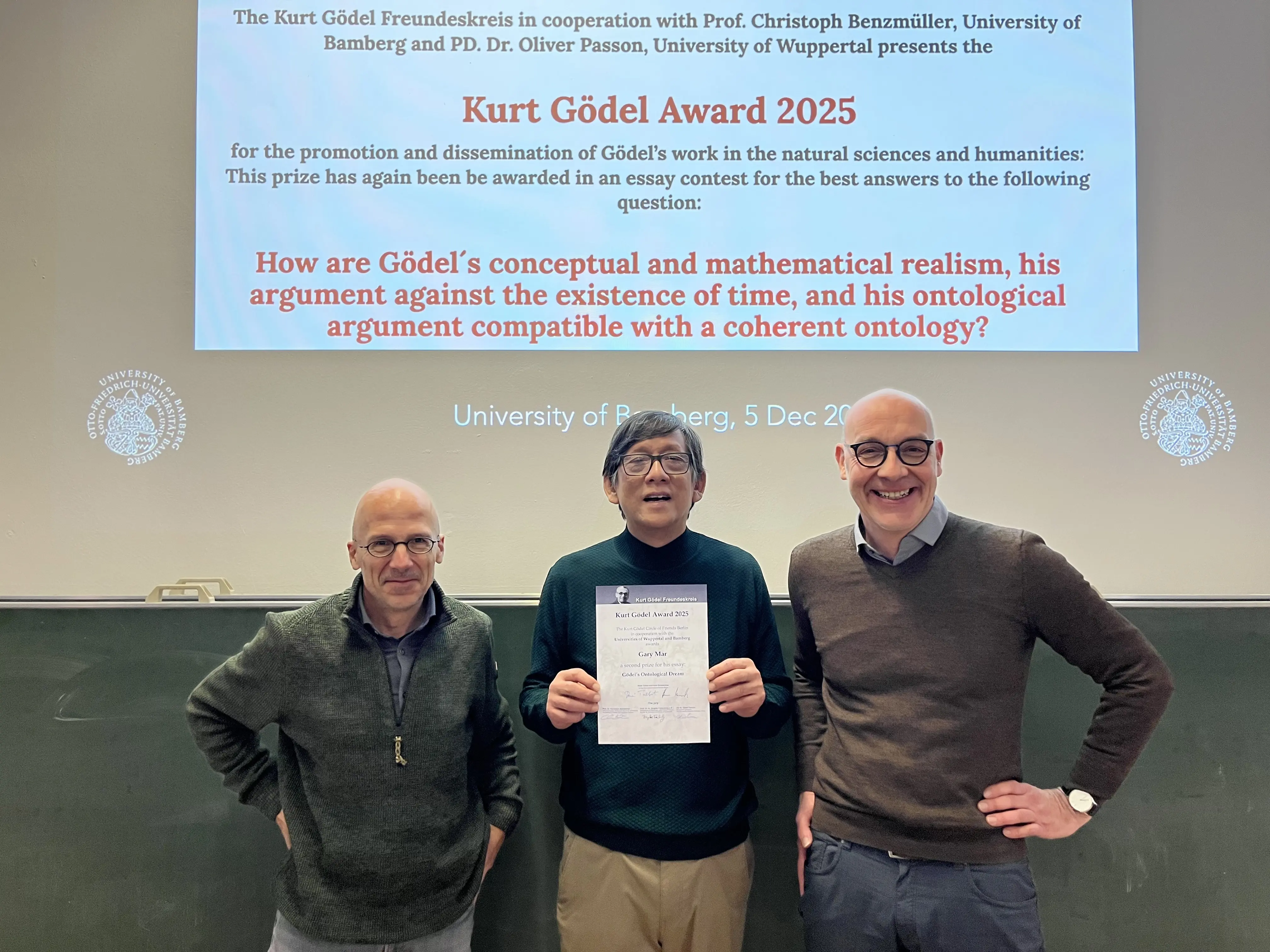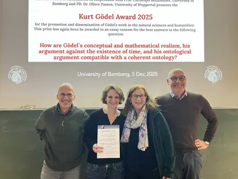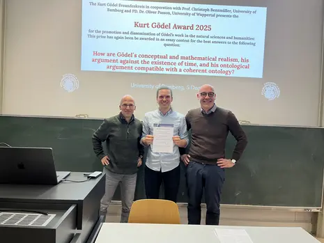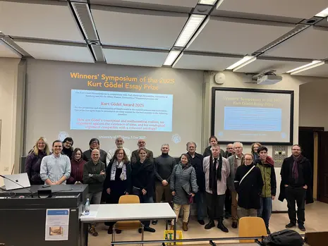 A. The Winners' Symposium of the 2025 Kurt Gödel Essay Prize(Dec 5, 2025) presents the winners of this year's essay award and offers them a forum for discussing their contributions with other researchers and the general public. The central question of the 2025 essay prize was: “How are Gödel's conceptual and mathematical realism, his argument against the existence of time, and his ontological argument compatible with a coherent ontology?” Contributions were sought that shed light on the topic from a logical, philosophical, and physical perspective and refer to the work of Kurt Gödel. The award winners are: