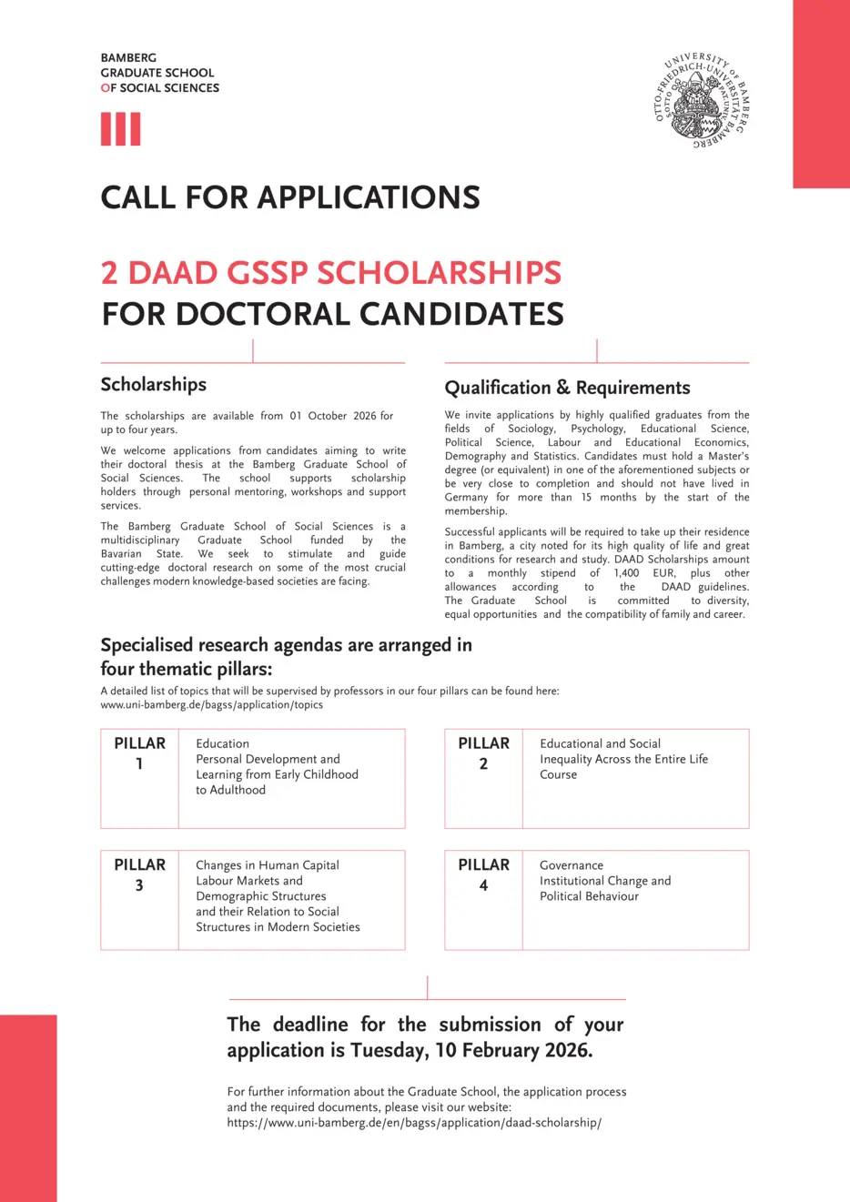The DAAD presented the Bamberg Graduate School of Social Sciences with the opportunity to nominate and host up to four international PhD students in 2025 and 2026 (two students a year). These DAAD scholarships are being awarded in the frame of the "DAAD Graduate School Scholarship Programme" (GSSP).