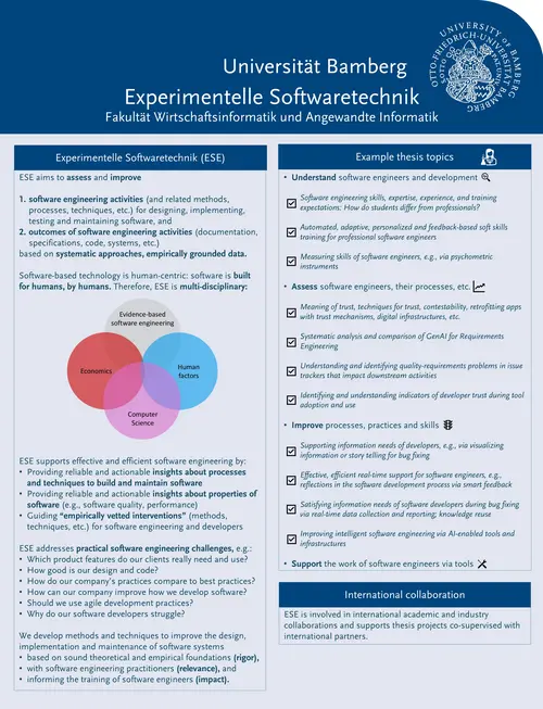 At the chair of Experimental Software Engineering (ESE) at the University of Bamberg we regularly offer topics for BSc or MSc thesis projects. However, feel free to also propose your own topics.