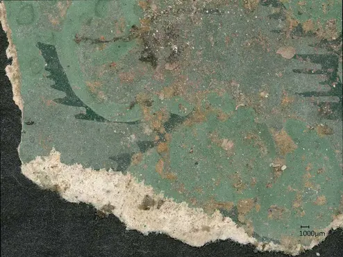 This microscopic close-up shows a printed piece of wallpaper from the 19th century. These wallpapers often contained the arsenic-containing Schweinfurt Green. How to deal with such a finding is being worked out in the LINK project.