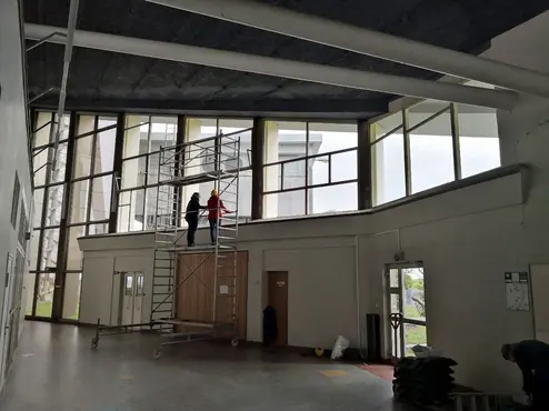 DFG project Cultural Heritage Construction MatGlas; cluster meeting in the Europe 1 broadcasting hall, Berus in Sept. 2021. Ruth Tenschert and Alexandra Schmölder document the windows on the rear façade.