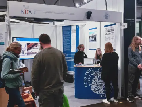 Meet & Greet at the booth by student and staff representatives of the Centre for Heritage Conservation Studies and Technologies (KDWT) at denkmal - European trade fair for preservation, restoration and old building renovation 2022 in Leipzig.