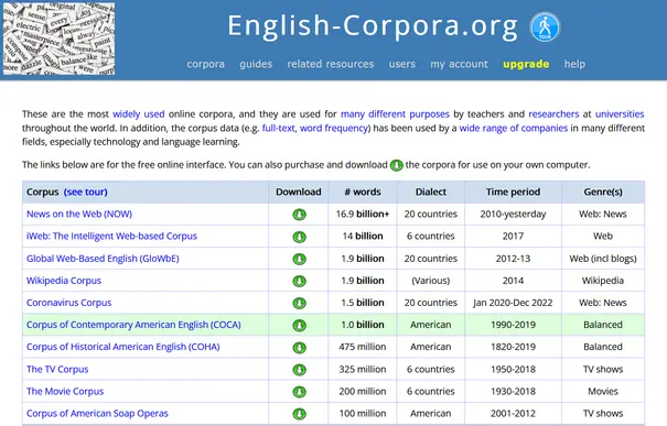 In this course, corpora (i.e. text databases) are accessed through English-Corpora.org, a very popular and user-friendly platform freely available (with a daily limit) on the web and workable even on mobile phones. You can carry loads of information on the English language in your pocket!