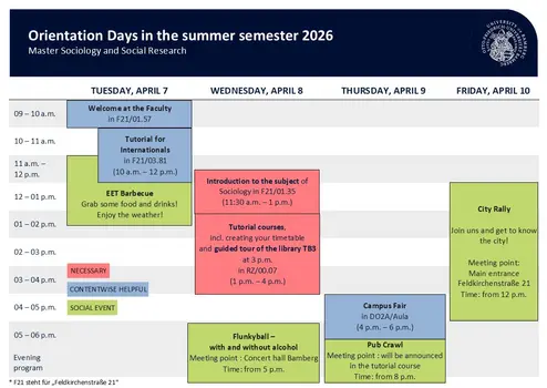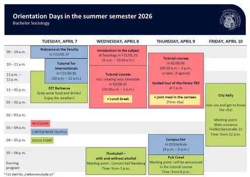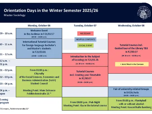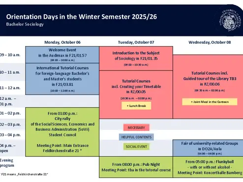 Every semester, one week before the start of the lecture period, the Orientation Days take place. In addition to general information about studying at the University of Bamberg, you will receive specific information about studying Sociology in Bamberg as part of an introduction to the subject and in the tutorial courses.