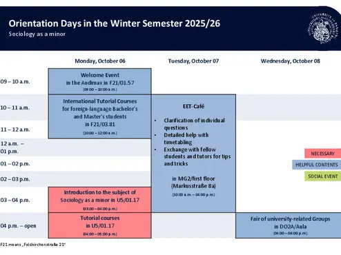 All important information about the minor subject Sociology will be given in the introduction to the subject and in the tutorial session on Monday, October 06. In addition, you can find all other dates for your major subjects on the websites of the central student advisory sercive.