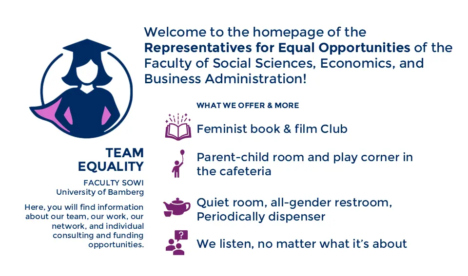 Our work mainly focuses on our faculty and is therefore specifically aimed at its members. In addition, we are happy to refer questions about gender equality, diversity, equal opportunities, and anti-discrimination to the university-focused bodies of the Women's Office, the University-wide Women's Representatives, and the Vice President for Diversity and International Affairs and their offices.