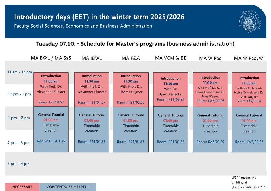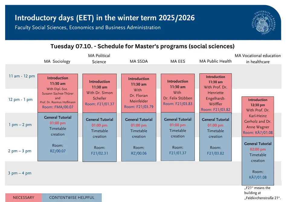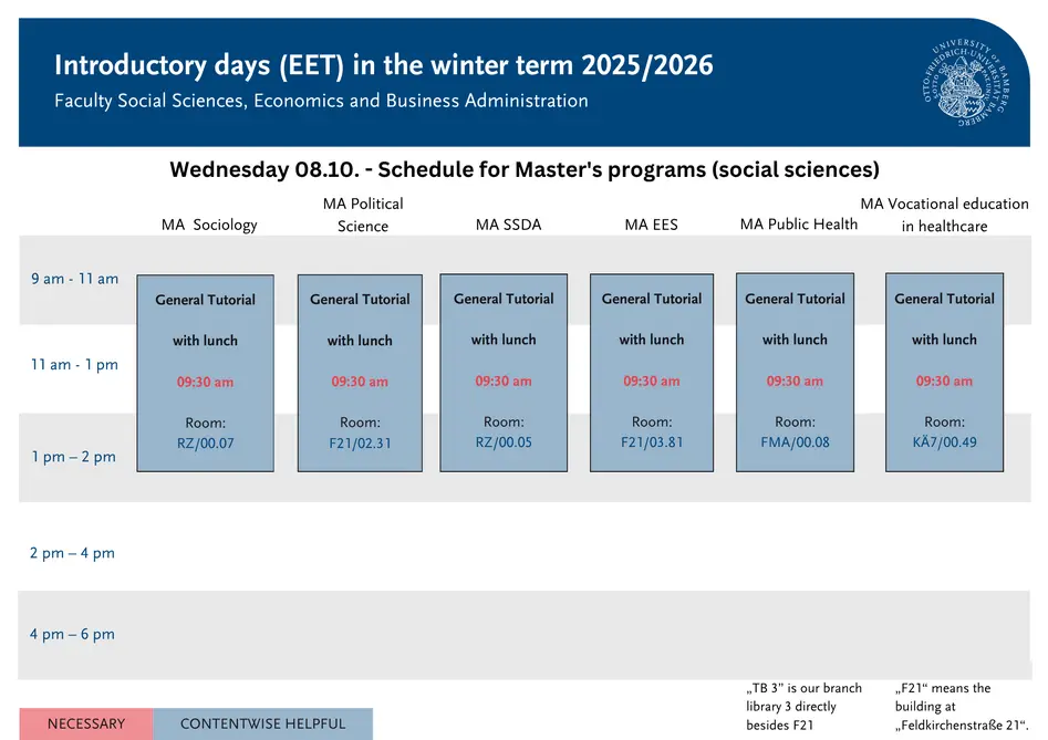 Here you will find a more detailed description of the individual events offered during the EET. Events marked with necessary are essential for you to attend. For events labeled helpful content, you can decide whether you already have the required prior knowledge or if you can learn something new here. Social events do not provide new content, but help you get to know the university, the city, and your fellow students better.