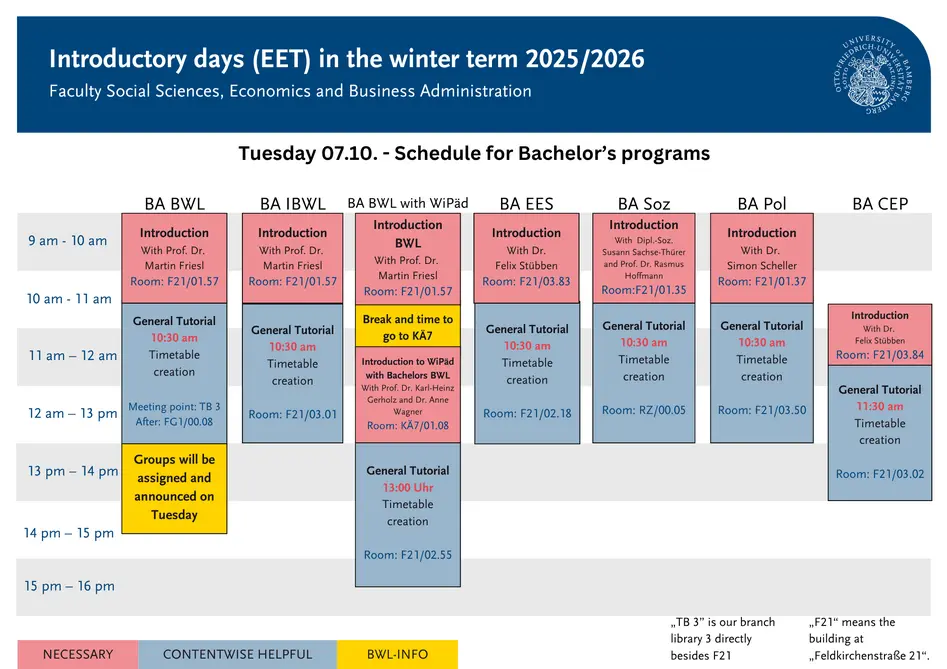 During the first semester introductory days (EET), a variety of events are offered to make your start into your studies at the University of Bamberg as easy as possible. The most important event is the subject introduction with the subject tutorial, which is offered for every degree program. This tutorial should be attended and helps to start the first weeks of your studies in an organised and stress-free way. It is recommended to attend as many on-site events as possible in order to get the best possible start to your studies.