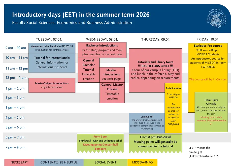 During the first semester introductory days (EET), a variety of events are offered to make your start into your studies at the University of Bamberg as easy as possible. The most important event is the subject introduction with the subject tutorial, which is offered for every degree program. This tutorial should be attended and helps to start the first weeks of your studies in an organised and stress-free way. It is recommended to attend as many on-site events as possible in order to get the best possible start to your studies.