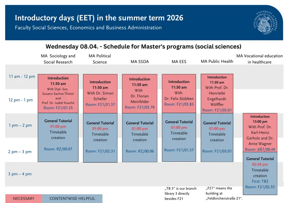 Here you will find a more detailed description of the individual events offered during the EET. Events marked with necessary are essential for you to attend. For events labeled helpful content, you can decide whether you already have the required prior knowledge or if you can learn something new here. Social events do not provide new content, but help you get to know the university, the city, and your fellow students better.