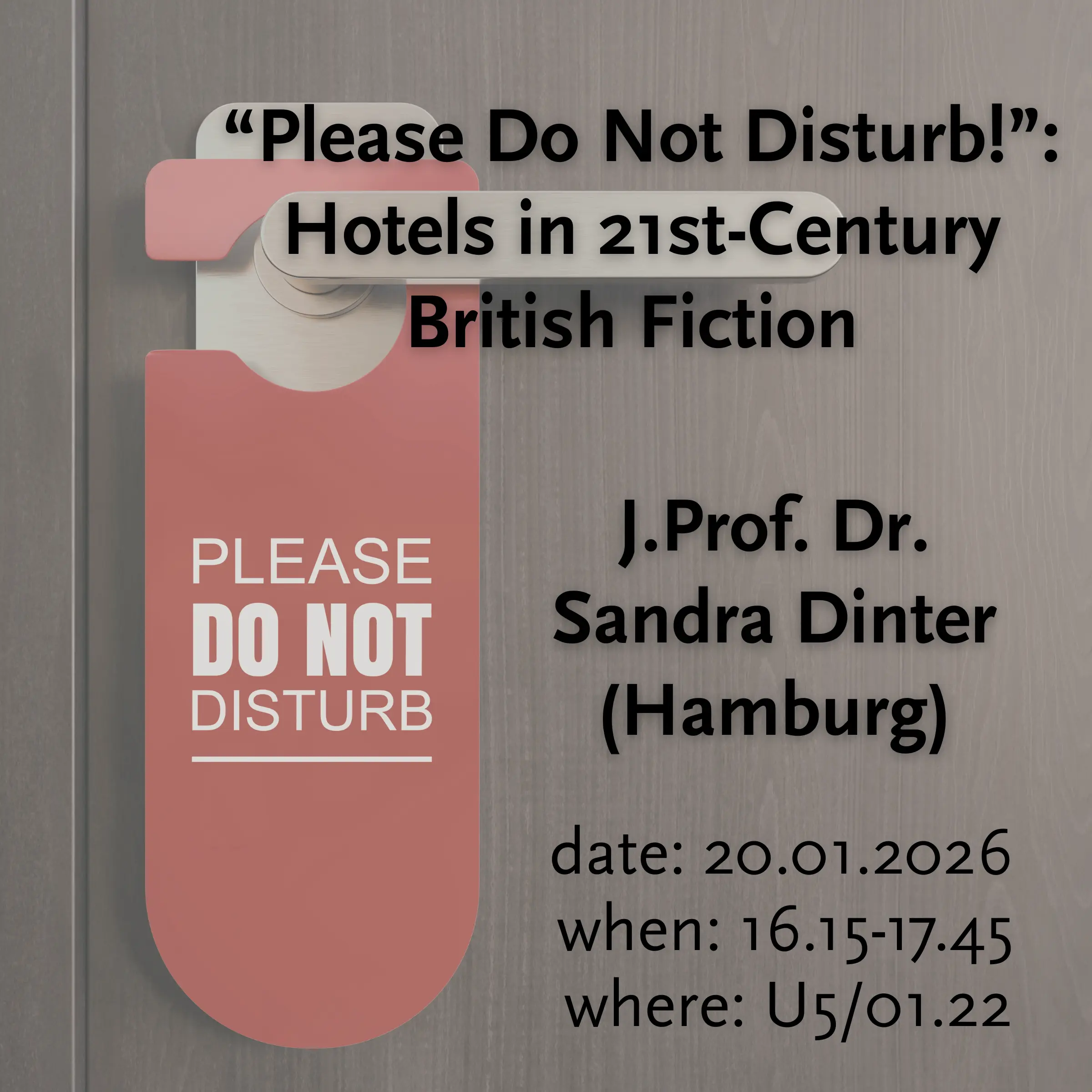 You are very welcome to attend the guest lecture "'Please Do Not Disturb!': Hotels in 21st-Century British Fiction" by J.Prof. Dr. Sandra Dinter (University of Hamburg).