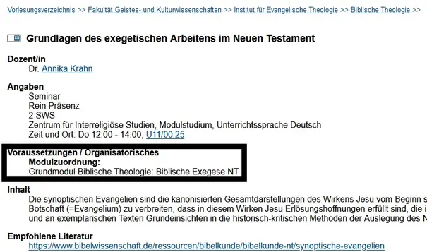 - Sie finden die Lehrveranstaltungen der Evangelischen Theologie unter „Vorlesungsverzeichnis“ → „Fakultät Geistes- und Kulturwissenschaften“ → „Institut für Evangelische Theologie“. Dort können Sie dann den jeweiligen Fachbereich auswählen, in dem Sie eine Lehrveranstaltung besuchen möchten.