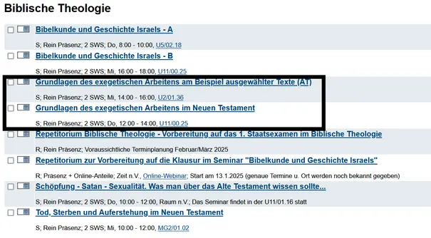 - Nun können Sie im UnivIS nach den Seminaren (in der Übersicht gekennzeichnet mit dem Buchstaben "S") suchen. Sie finden die Liste aller Veranstaltungen der Biblischen Theologie unter Vorlesungsverzeichnis → Fakultät Geistes- und Kulturwissenschaften → Institut für Evangelische Theologie → Biblische Theologie.