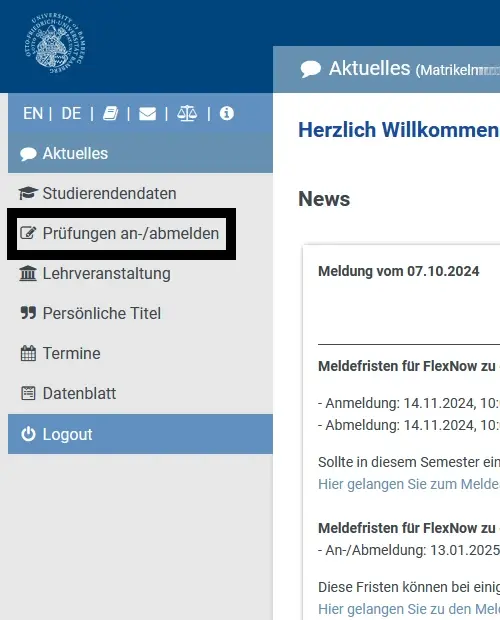 Gegen Ende des Semesters können Sie sich zu den Prüfungen an beiden Lehrstühlen anmelden.