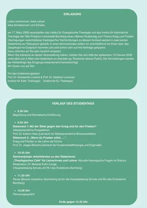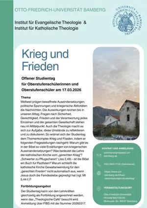 Das Institut für Evangelische Theologie und das Institut für Katholische Theologie der Otto-Friedrich-Universität Bamberg veranstalten am 17. März 2026 einen offenen Studientag für Schülerinnen und Schüler der gymnasialen Oberstufe bzw. der FOS/BOS.