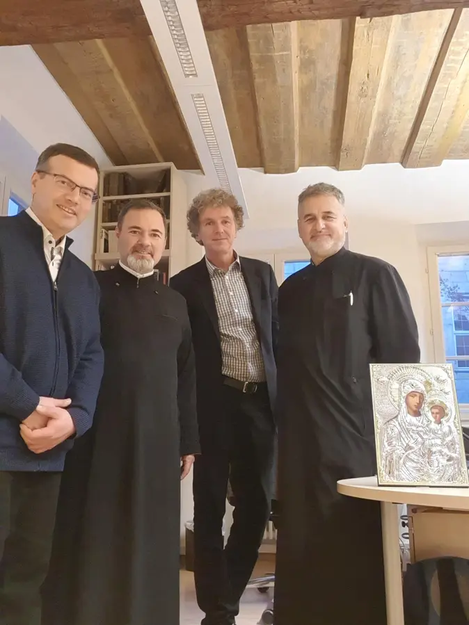 Zwei Professoren aus Rumänien, Priester Prof. Dr. Mihai Teodorescu und Priester Prof. Dr. Alexandru Arion, von der Fakultät für Orthodoxe Theologie der Universität Wallachia, Targoviste, besuchten vom 8.-12. Dezember die Otto-Friedrich Universität Bamberg. Auf Einladung des Lehrstuhls für Evangelische Theologie und theologische Gegenwartsfragen hin hielten sie, im Rahmen des Erasmus Austausch-Programms, im Seminar von Prof. Dr. Daniel Munteanu - "Ökumenische Trinitätslehre", Vorträge in ökumenischer Perspektive u.a. zur Monotheismus-Debatte und zu triadischen Vorstellungen im Hinduismus. Ihre wissenschaftlichen Impulse stellten für die Studierenden eine regelrechte Bereicherung und einen spannenden und konstruktiven Austausch dar. Sie luden Herrn Prof. Wabel ein, Rumänien mit Studierenden aus Bamberg zu besuchen, damit der wissenschaftliche und ökumenische Dialog fortgeführt wird.