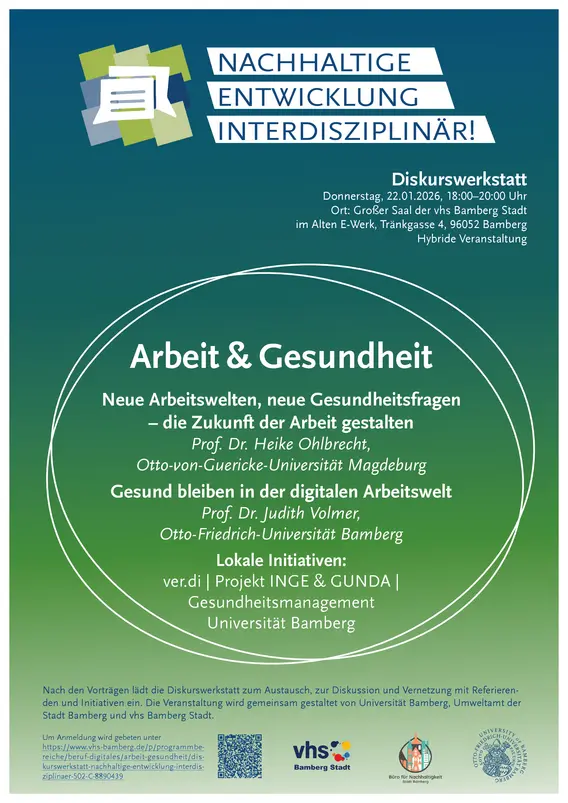 Buchbar über die VHS Bamberg-Stadt: www.vhs-bamberg.de/p/programmbereiche/gesundheit/arbeit-gesundheit/diskurswerkstatt-nachhaltige-entwicklung-interdisziplinaer-502-C-8890439