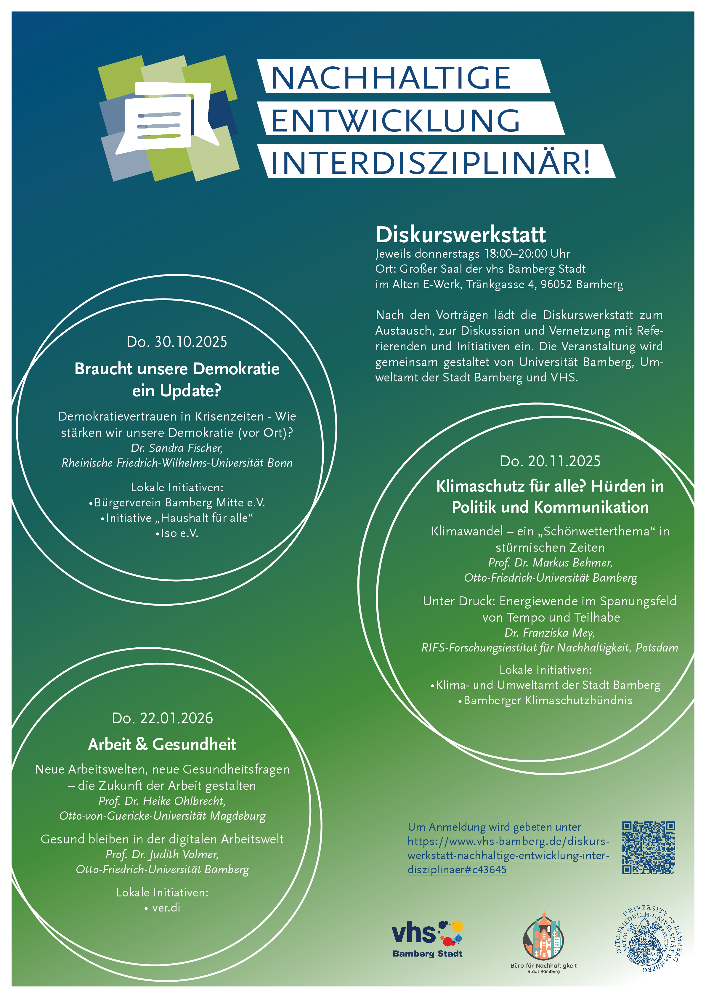 Buchbar über die VHS Bamberg-Stadt: www.vhs-bamberg.de/p/programmbereiche/gesundheit/arbeit-gesundheit/diskurswerkstatt-nachhaltige-entwicklung-interdisziplinaer-502-C-8890439