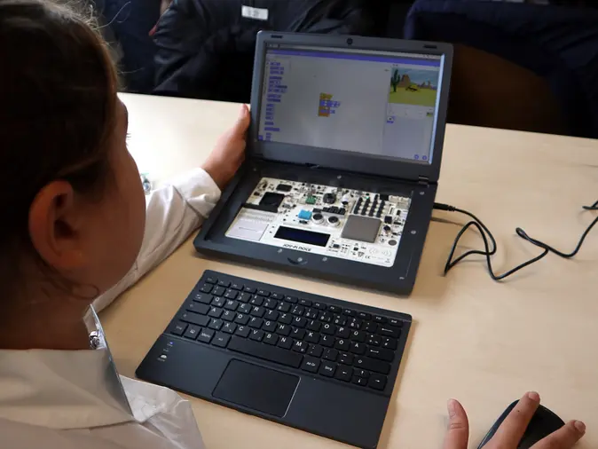Im Workshop haben wir mit den Teilnehmerinnen die Grundlagen von Algorithmen, dem EVA-Prinzip (Eingabe-Verarbeitung-Ausgabe), und Programmierung in Scratch gelernt, und sogar mit Hilfe unserer JoyPi-Note Lernlaptops praktisch das Bauen von leichten Schaltkreisen ausprobieren können. Das Endergebnis des Workshops war ein unter Anleitung selbst programmiertes Spiel, in dem die Spielerin zwei Spielfiguren gleichzeitig durch ein Labyrinth steuern musste, um zu gewinnen.