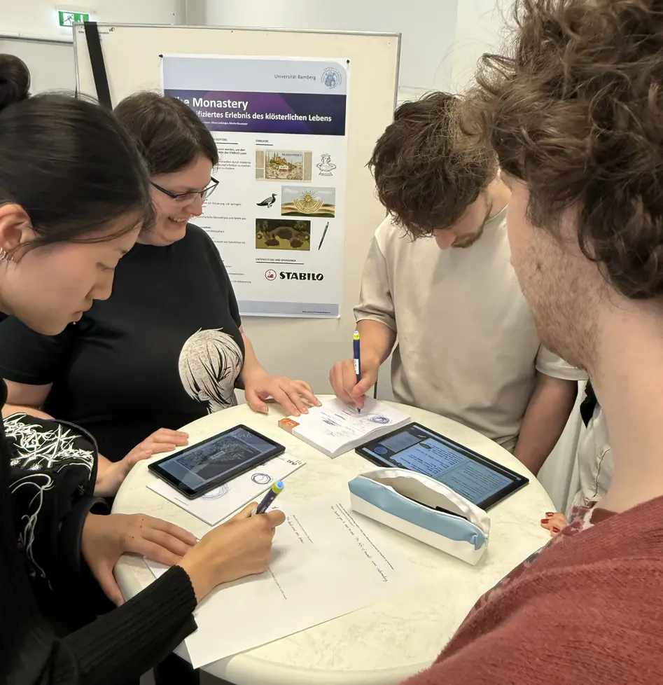 Das Projekt "The Monastery" entstand aus der kreativen Aufgabe, eine innovative Anwendung für den STABILO Lunis zu entwickeln. Unser Team nutzte diese technologische Vorgabe, um eine Lösung für die spielerische Vermittlung von historischen Bildungsinhalten zu schaffen. Die haptischen und bewegungssensitiven Eigenschaften des Stifts boten dabei die ideale Grundlage, um Lerninhalte nicht nur visuell, sondern auch physisch erfahrbar zu machen. Das entwickelte System adressiert die Herausforderung, dass abstrakte historische Themen für junge Lernende oft schwer zugänglich sind, und begegnet parallel dem Problem von Schreibhemmnissen. Die Leitidee des Konzepts war es, herauszufinden, wie ein gamifiziertes Erlebnis den Alltag in einem mittelalterlichen Kloster mit dem Stift erfahrbar machen kann. Um dieses Ziel zu erreichen, stützte sich das Design auf etablierte motivationstheoretische Ansätze. Insbesondere die Selbstbestimmungstheorie (Deci & Ryan, 2000) diente als Leitfaden, um durch die Gewährung von Autonomie und die Förderung von Kompetenzerleben die intrinsische Motivation zu stärken. Ergänzend wurde die Flow-Theorie (Csikszentmihalyi, 1990) angewendet, um einen Zustand tiefer Immersion zu ermöglichen. Das System kombiniert eine authentische mittelalterliche Ästhetik mit motivierenden Spielmechaniken, die durch physische Stiftgesten wie Schütteln oder Kippen gesteuert werden. Eine empirische Evaluation mit 18 Teilnehmenden bestätigte den Erfolg des Konzepts und validierte die zugrundeliegenden Designentscheidungen. Die quantitativen Daten zeigten hohe Bewertungen für die erlebte Autonomie (Ø 6.2/7) und das Fortschrittsgefühl (Ø 6.3/7). Die innovative Stiftsteuerung wurde als hochgradig immersiv, wenngleich anfangs gewöhnungsbedürftig, bewertet. Qualitative Rückmeldungen untermauerten diese Befunde und bestätigten zudem einen erfolgreichen Wissenserwerb über das Klosterleben. Zusammenfassend demonstriert "The Monastery" erfolgreich, wie eine technische Vorgabe als Ausgangspunkt für die Entwicklung einer bedeutungsvollen Lernerfahrung dienen kann. Die hohe Wiederspielabsicht (Ø 5.8/7) und Weiterempfehlungsbereitschaft (Ø 6.0/7) validieren den gewählten Ansatz. Das Projekt unterstreicht damit das erhebliche 1/ 4 Potenzial, das in der Synthese von physischen Interaktionsgeräten, Gamification und pädagogischen Inhalten für zukünftige digitale Bildungstechnologien liegt.