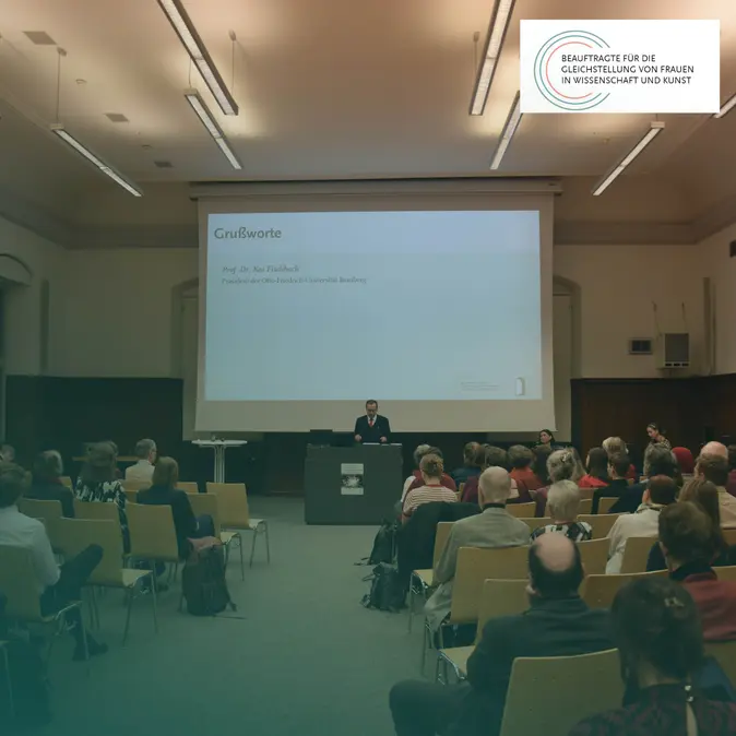 Als an sich diesem Abend Student*innen, Professor*innen, Mitarbeiter*innen und Gäst*innen im Hörsaal der U7 versammeln wird deutlich, wie bunt die Gleichstellungslandschaft an der Universität Bamberg ist und wie divers diejenigen, die sich dafür einsetzen. So finden sich Menschen unterschiedlichen Alters und unterschiedlicher Herkunft sowie aus Elternhäusern mit und ohne akademischen Hintergrund. Dies macht deutlich: Gleichstellung ist ein Querschnittsthema und so lassen sich viele Beiträge des Abends als ein Aufruf verstehen, Barrieren abzubauen und Vielfalt zu schaffen. Begleitet wird der Abend musikalisch von den beiden Studentinnen Emma Soderer und Sofia Krause.