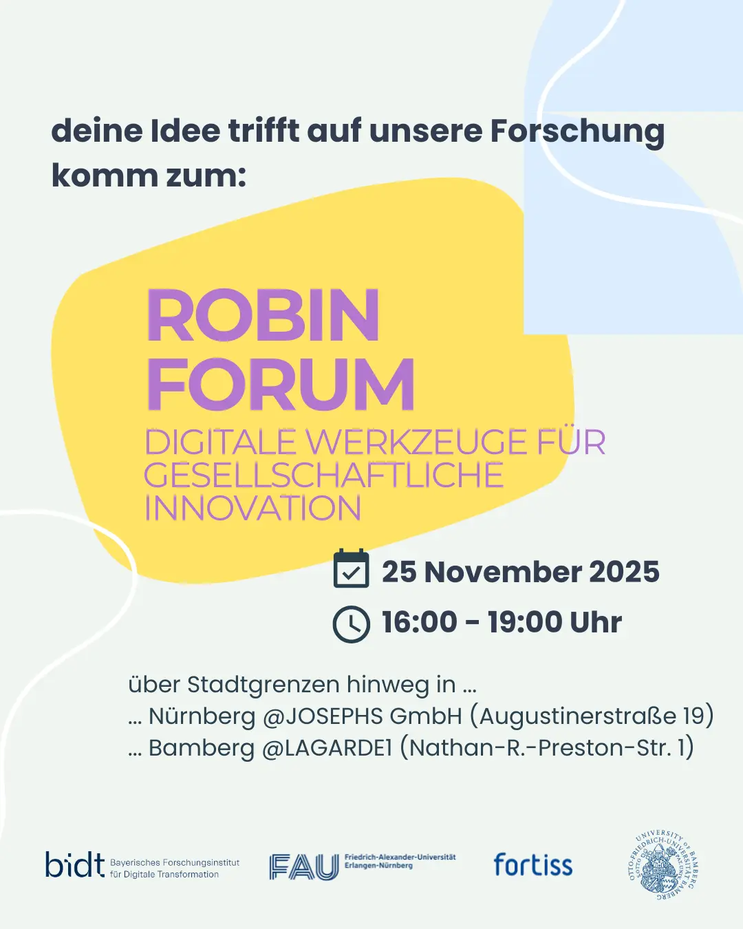 Für Snacks und Getränke ist gesorgt. Um eine bessere Planung zu ermöglichen, bitten wir um Anmeldung unter https://www.robin.wi1.rw.fau.de/robin-forum-25-11-25/. Kurzentschlossene sind jedoch ebenso gern gesehen.