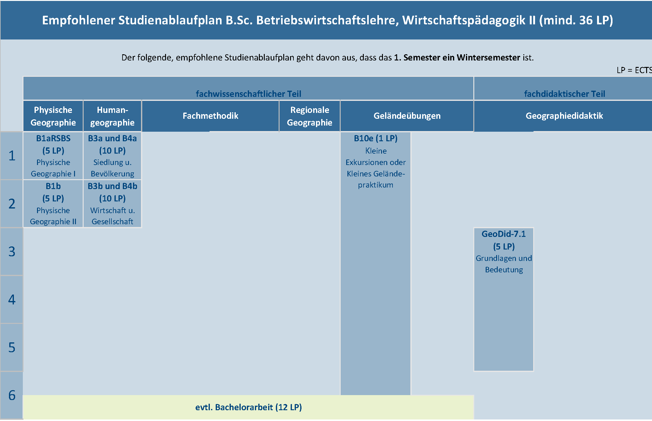 Im Bachelorstudiengang BWL (B.Sc. BWL, Wirtschaftspädagogik II) kann Geographie als weiteres Unterrichtsfach gewählt werden. Das Geographiestudium (36 ECTS-Punkte) setzt sich aus den Basismodulen der Physischen Geographie (10 ECTS-Punkte) und Humangeographie (20 ECTS-Punkte) zusammen, deren Inhalte durch das Grundlagenmodul der Geographiedidaktik (5 ECTS-Punkte) und mindestens einer Geländeübung (1 ECTS-Punkt) eine praxis- bzw. unterrichtsbezogene Verzahnung erfahren.